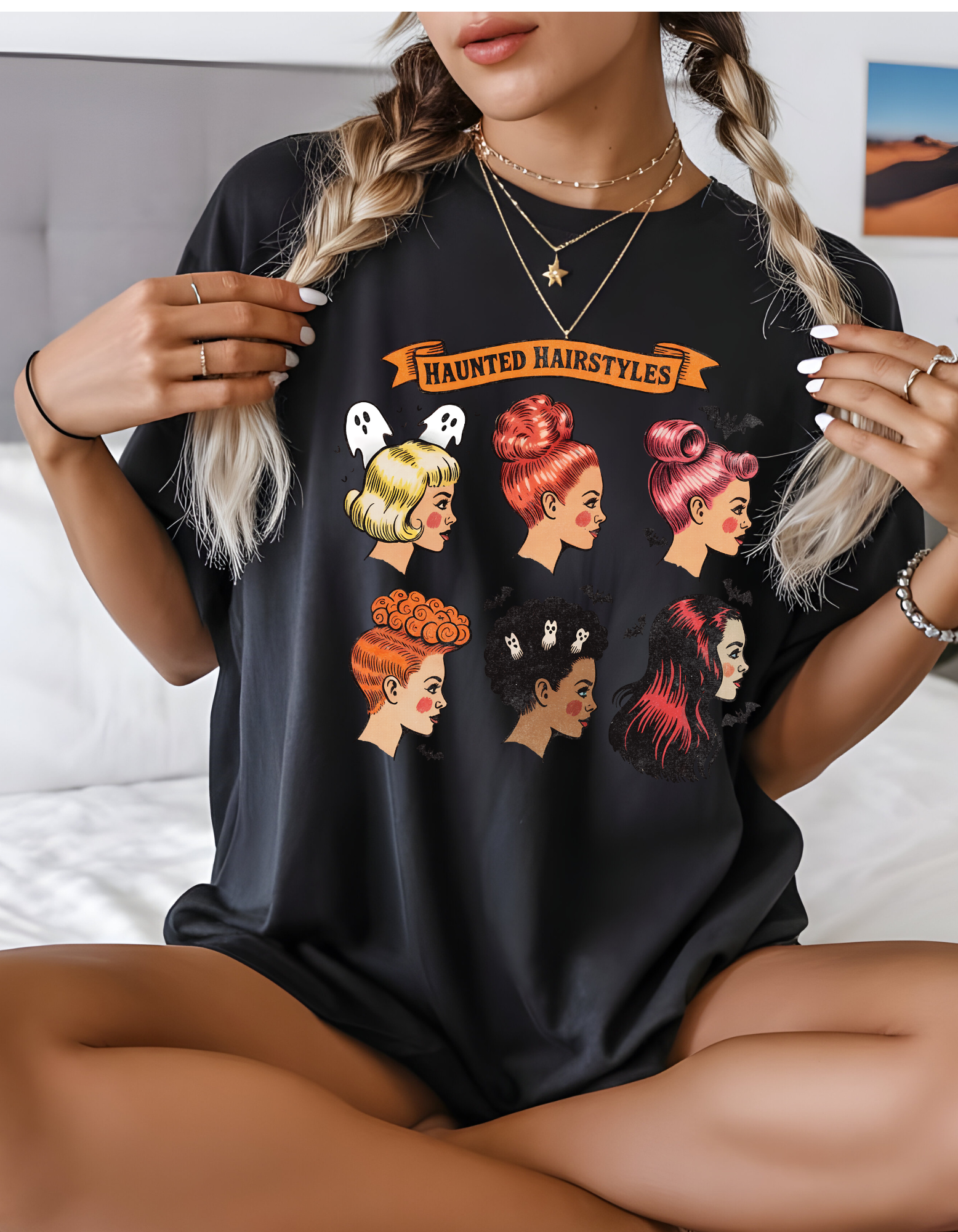 Say boo-tiful louder for the ghouls in the back π» This retro-inspired tee is serving major haunted glam with a lineup of iconic Halloween hairstyles β from ghost buns to batty bouffants. Whether you're casting spells or just sipping cider, this spooky-chic look is all treat, no trick. Perfect for spooky season slayage π·οΈπβοΈ