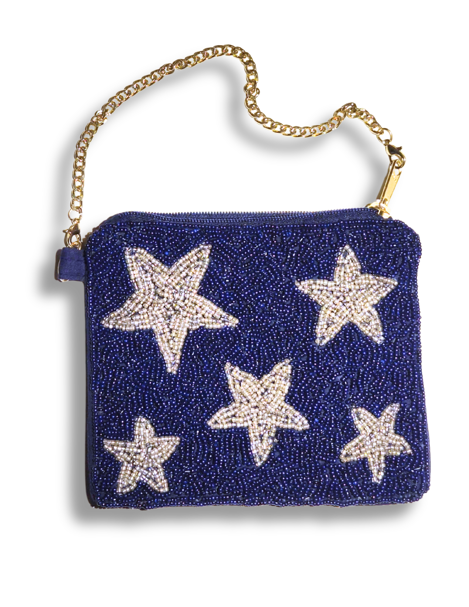 Add some shine to your sidelines with the Cowgirls & Stars coin purse — your perfect accessory for Dallas game days or tailgate nights. This beaded beauty brings the sparkle with silver stars on a Cowboys-blue background and a gold chain strap to keep things hands-free for nachos and touchdowns. Whether you're stadium-bound or hosting a living room watch party, this little pouch brings major glam to your football fit. 💫🏈