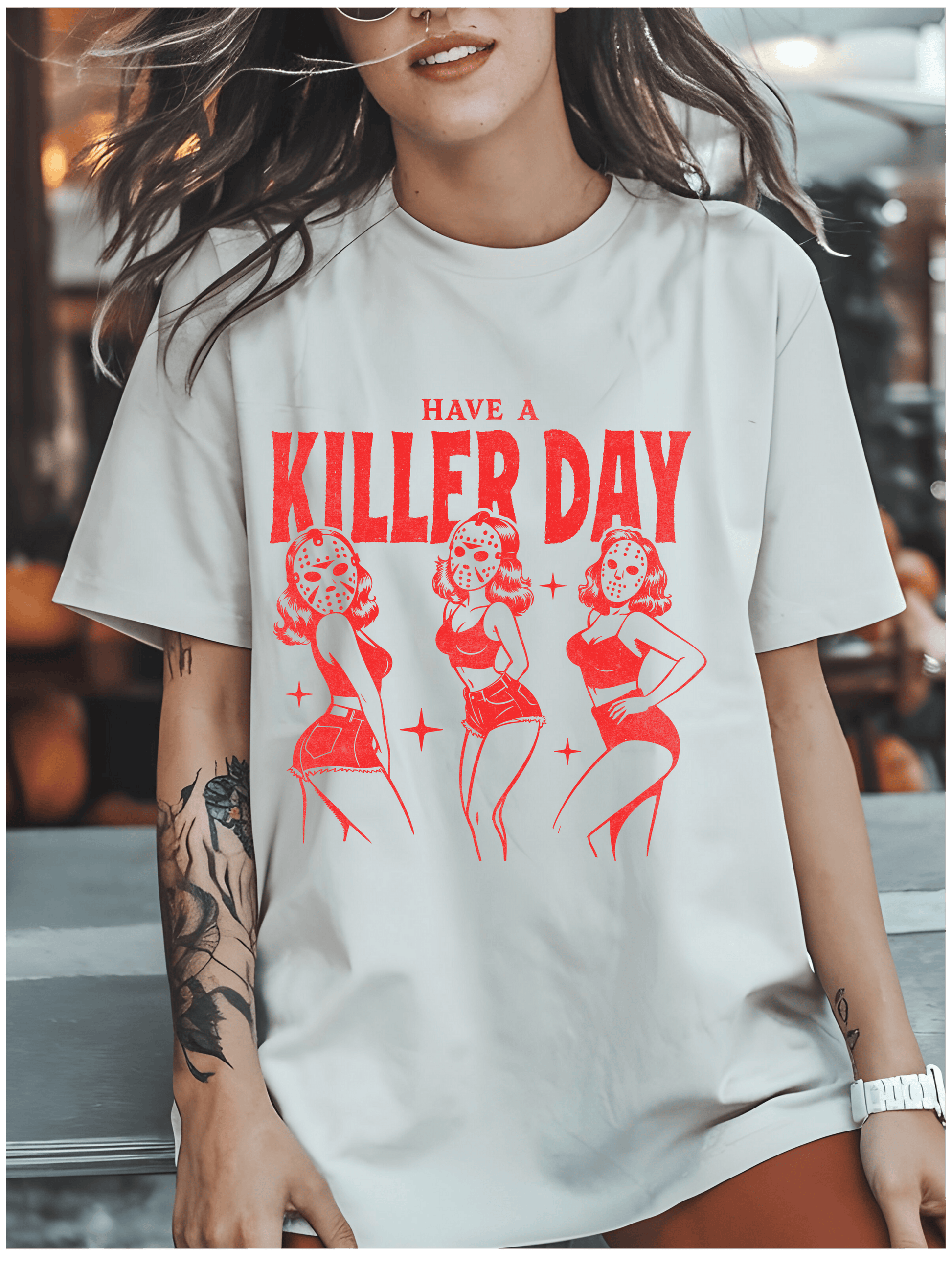 Start your day with a killer attitude in the Slay All Day Tee—where vintage pin-up meets horror chic. Featuring three fierce babes rockin' Jason masks and major sass, this tee is perfect for Halloween season or whenever you’re feeling a little extra deadly. 🖤✨