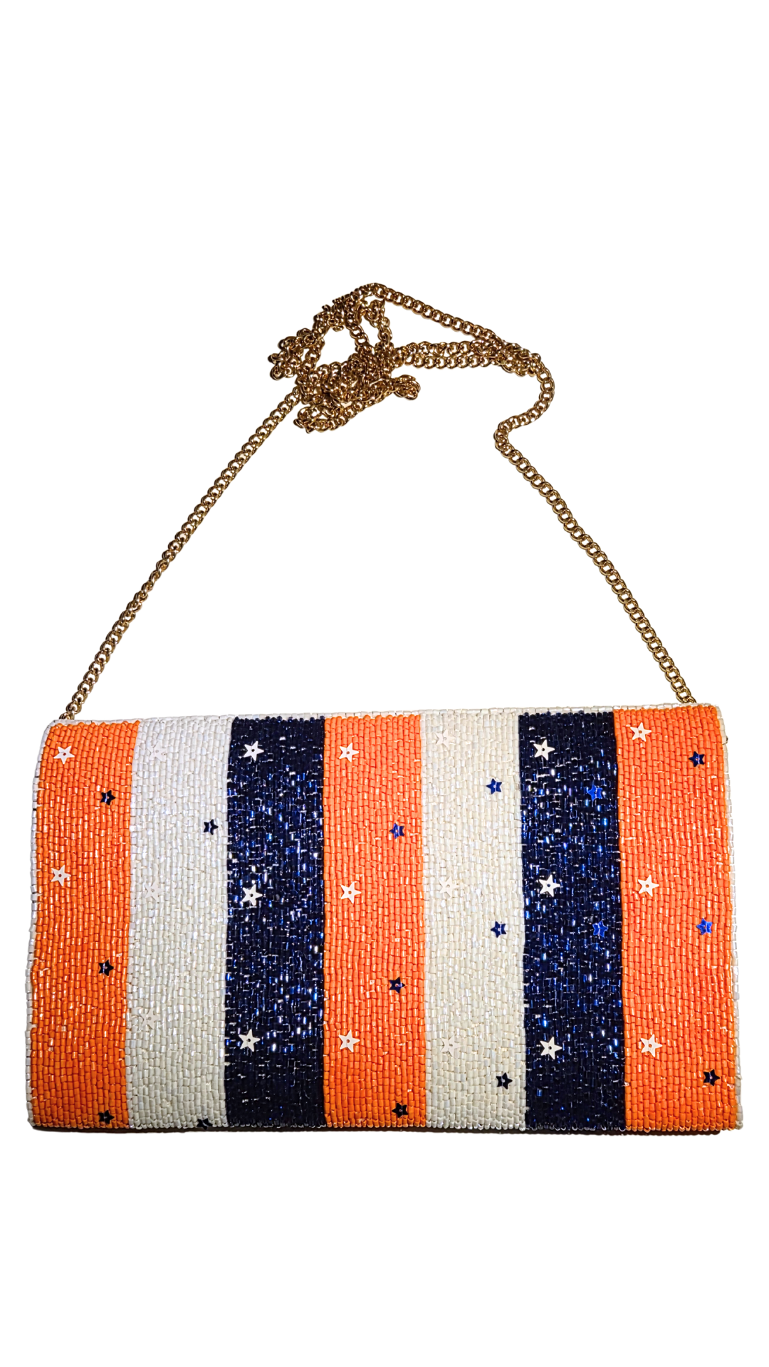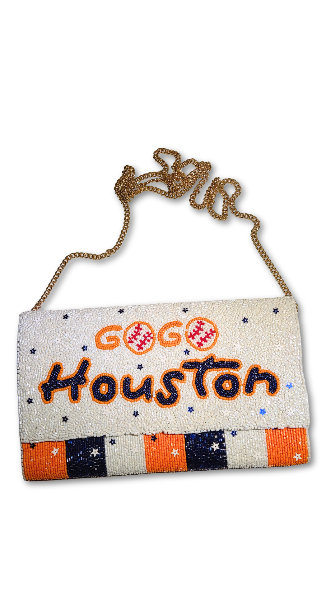 Hit the ballpark or your favorite rooftop in full glam fan mode. The Game Day Glitz – Houston Edition clutch is your ultimate MVP accessory—fully beaded, bold, and bursting with hometown pride. With a dazzling mix of navy, orange, and pearly white beads (plus baseball detailing that’ll make the crowd go wild), this statement piece is perfect for showing your team spirit while serving major style.
