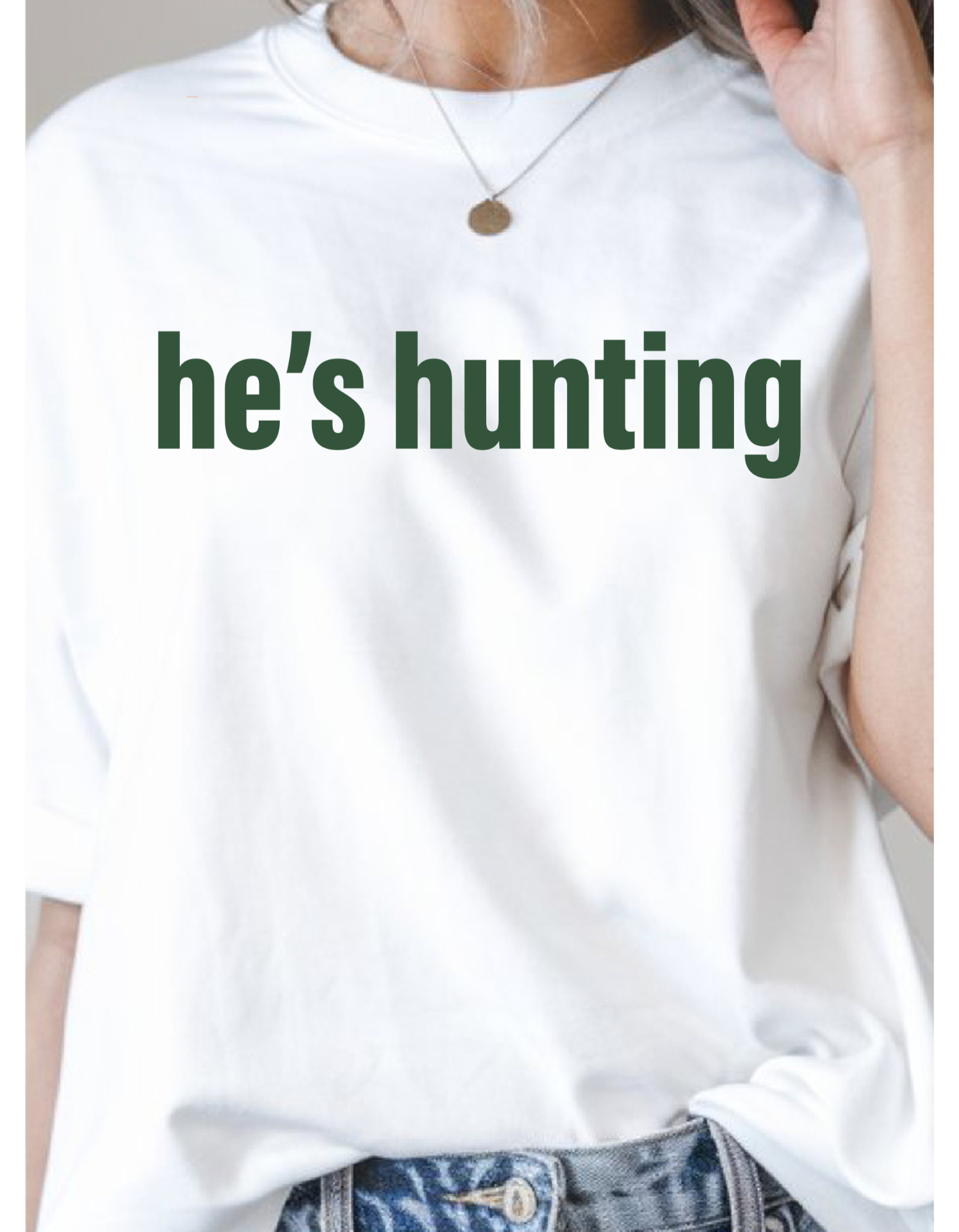 🤍 Clean white tee with “he’s hunting” on front
