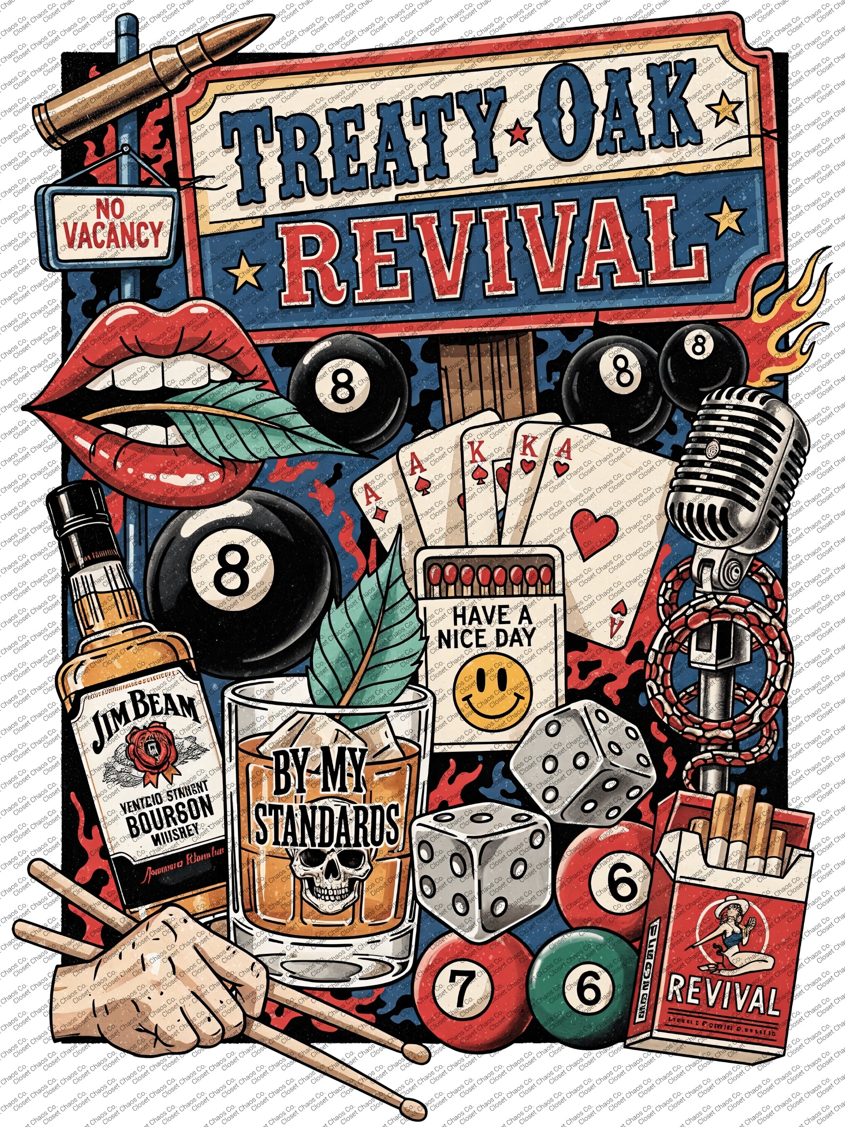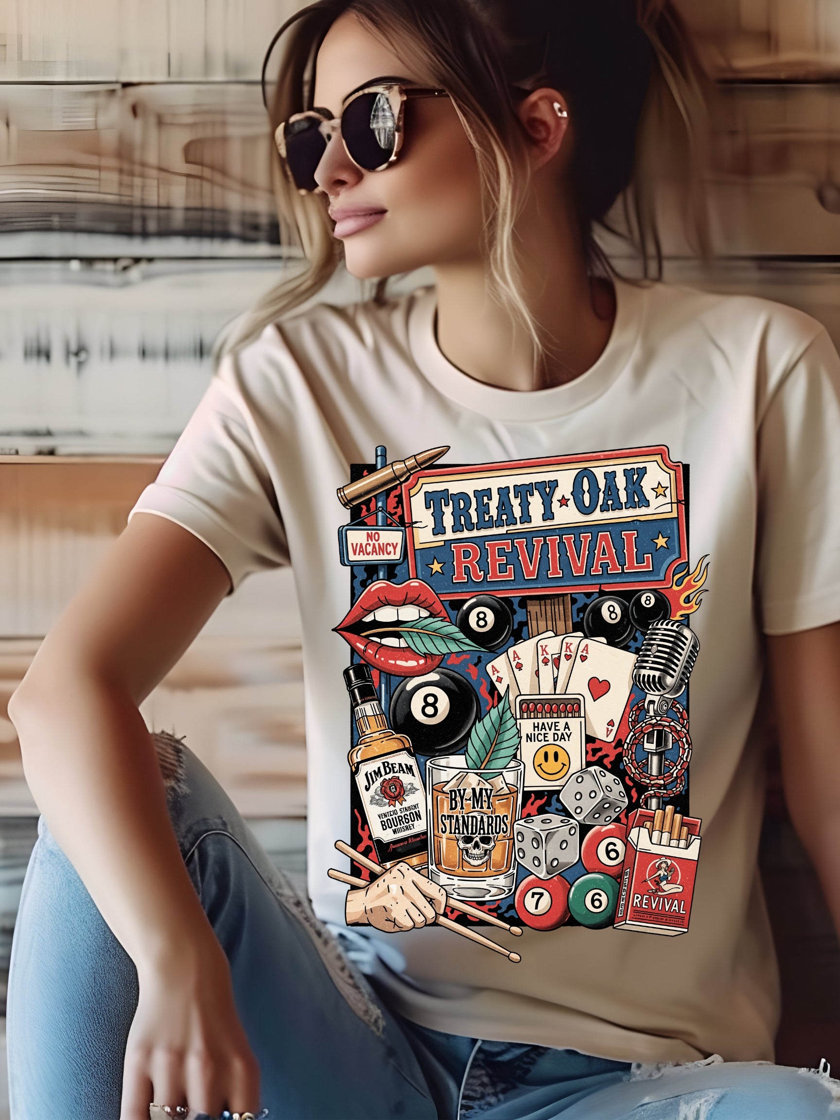 Bring the barroom energy and rock 'n' roll soul with the Revival Roadhouse tee! This bold and edgy graphic mashup is packed with everything you love—whiskey, pool, poker, and live music vibes. Whether you're front row at a concert or holding court at the dive bar, this shirt is your all-access pass to good times and wild nights. 🎸🎱🥃