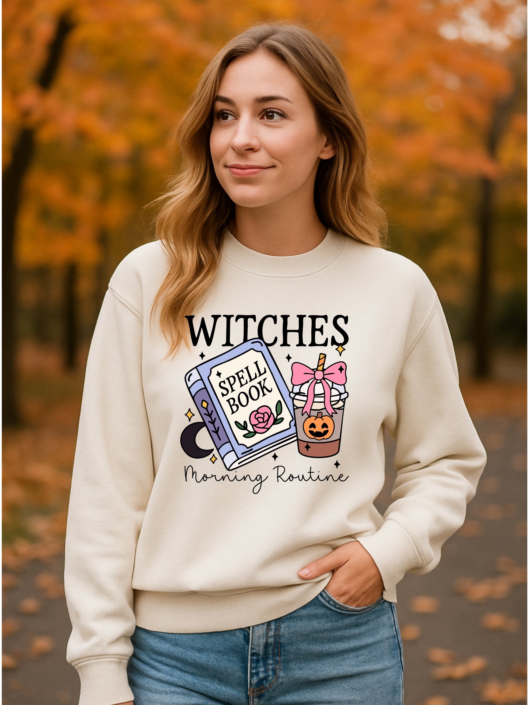 Start your day the bewitching way with our Witchy Morning Magic sweatshirt! Whether you're brewing spells or just coffee, this cozy pullover brings the cutest Halloween vibes from dawn to dusk. Featuring an enchanting spell book and pumpkin drink on the front, plus a full fall mood board on the back—this one’s for the ghouls who love spooky season in style! 🎃✨